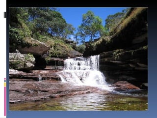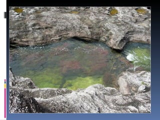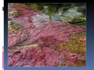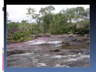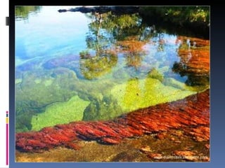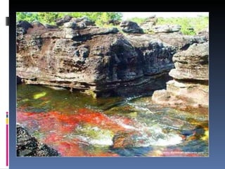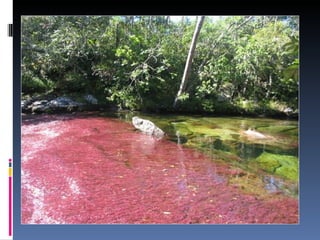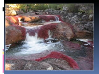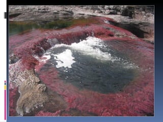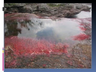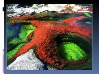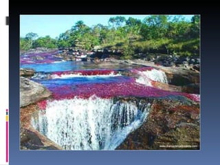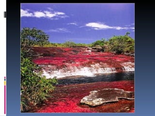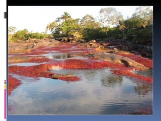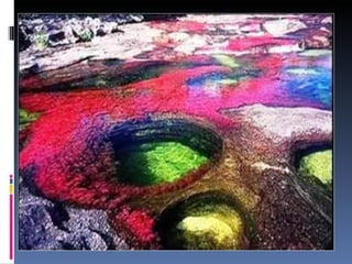O rio Caño Cristales na Colômbia é conhecido como "o rio mais formoso do mundo" por suas águas coloridas. Com cerca de 100 km de comprimento, o rio flui através do Parque Nacional Natural da Macarena e toma suas cores vibrantes de algas que florescem em suas pedras. Sua cor roxa característica vem de uma planta chamada "Macarenia clavigera".