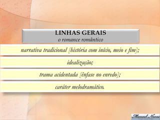 O documento discute os principais aspectos do romance romântico brasileiro: a idealização, a trama acidentada com suspense para manter o leitor interessado, e o caráter melodramático exagerado em obras como Lucíola de Alencar e Helena de Machado de Assis.
