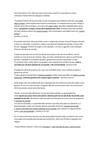 O documento discute como os judeus podem obter expiação dos pecados sem os sacrifícios do Templo, que foi destruído. A Torá mostra que o arrependimento sincero, confissão dos pecados e oração a Deus são suficientes para obter perdão, não sendo necessário sacrifício de sangue ou de vida humana. O documento também critica a interpretação cristã de que o sacrifício de Jesus foi necessário para a expiação dos pecados.