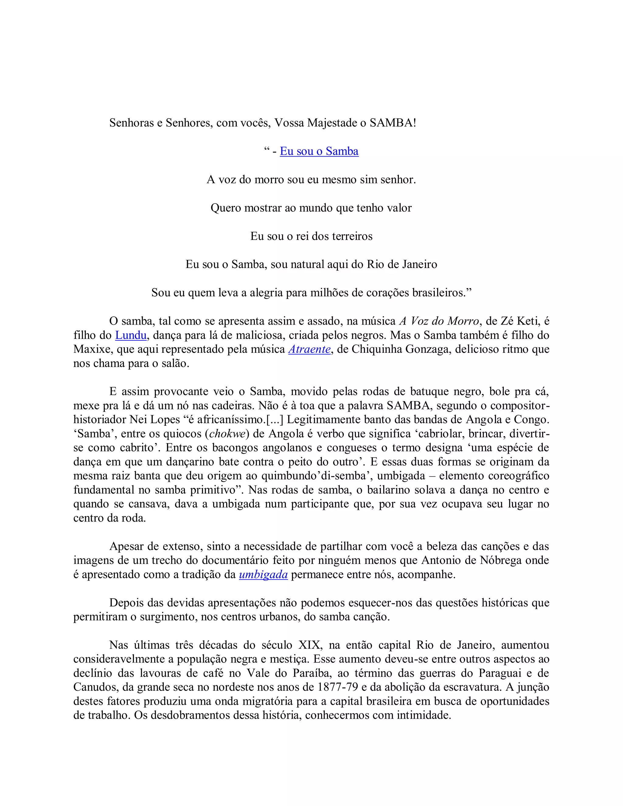 O documento apresenta a história e as origens do samba no Brasil, desde suas raízes africanas até seu desenvolvimento no Rio de Janeiro e em outros estados. Descreve estilos como samba de roda, samba de breque e partido alto, e artistas fundamentais como Pixinguinha, Noel Rosa e Paulinho da Viola. Conclui que o samba é um gênero híbrido e mutante, capaz de se reinventar constantemente.