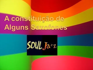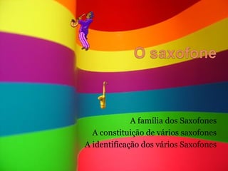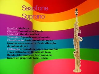 O documento descreve os quatro tipos principais de saxofones - soprano, alto, tenor e barítono. Detalha suas características como família, oitavas, tamanho, material e usos comuns. Também menciona que o inventor do saxofone foi Adolphe Sax, e por isso o nome do instrumento é derivado do seu sobrenome.