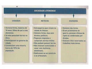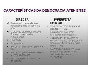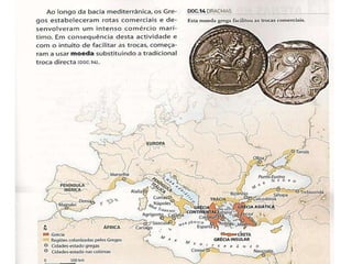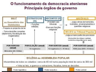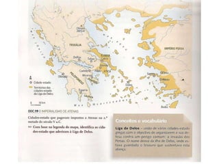 O documento descreve a história da Grécia Antiga, com foco no século V a.C. em Atenas. Aborda as civilizações pré-helénicas, a fixação dos helenos, a colonização grega e as características geográficas e econômicas da Grécia. Detalha a fragmentação política em cidades-estados e o apogeu cultural e econômico de Atenas sob Péricles, com a consolidação da democracia. No entanto, a democracia era imperfeita pois só os cidadãos particip