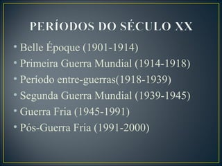 O documento descreve os principais acontecimentos do século XX, incluindo as duas guerras mundiais, a Guerra Fria e o avanço da tecnologia. O século XX foi marcado por grandes conflitos, mas também por progressos científicos e culturais que transformaram o mundo.