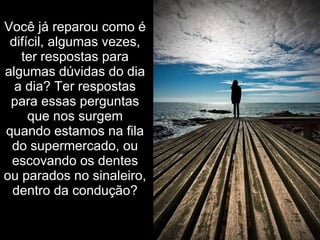 O documento discute que o sentido da vida é aprender a amar através das oportunidades e desafios que nos são apresentados, como doenças, dificuldades financeiras e relacionamentos difíceis. A vida oferece essas lições para que possamos desenvolver virtudes como resignação, fé, compreensão e paciência. O maior mandamento de Deus é o amor, e a escola da vida nos ensina a amar diariamente.