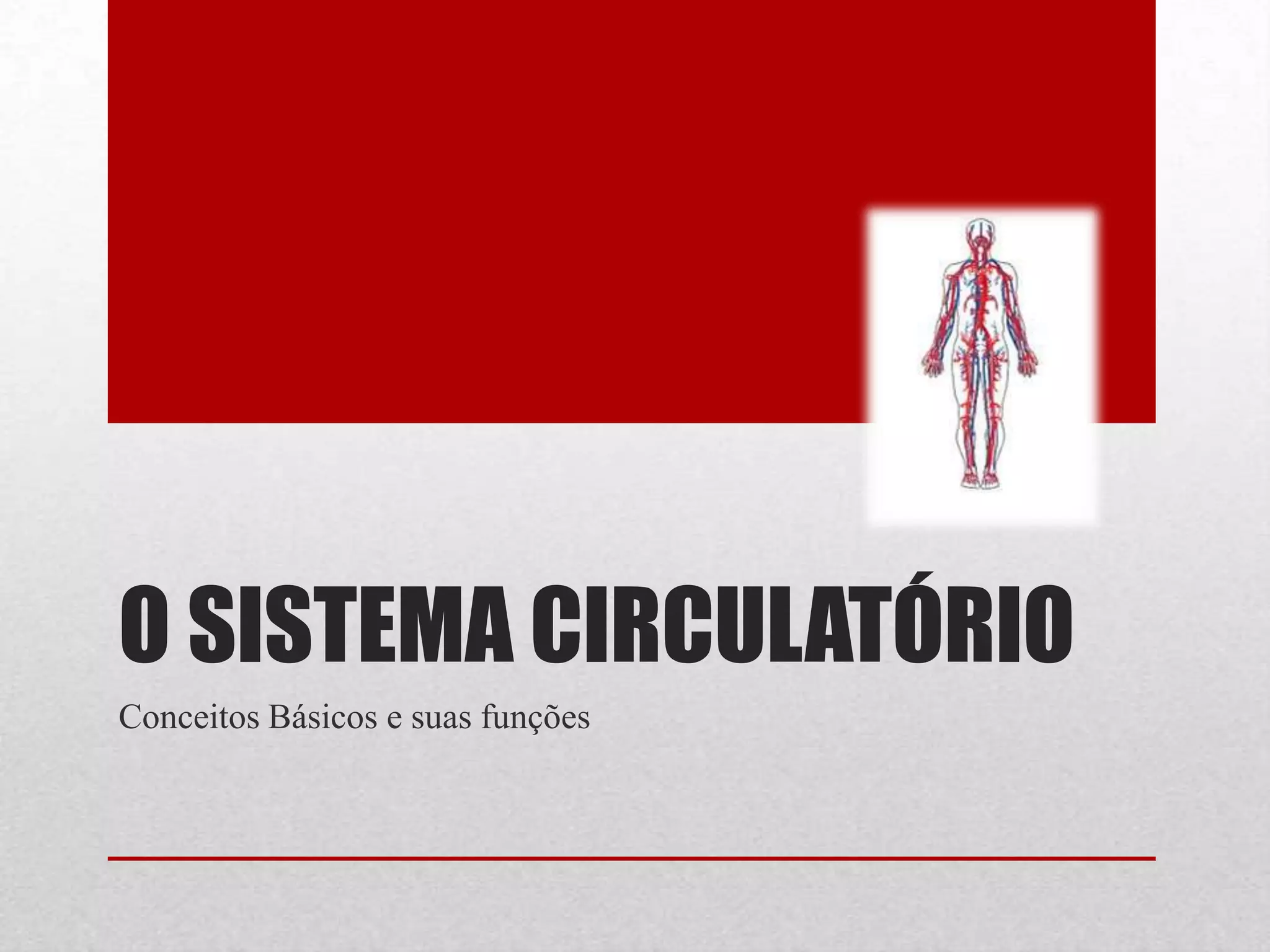 O documento descreve o sistema circulatório e suas funções. O sistema circulatório transporta nutrientes, gases e substâncias para as células e remove resíduos. É composto pelo sistema cardiovascular, que transporta o sangue, e pelo sistema linfático, que distribui a linfa. O sistema circulatório fornece oxigênio e nutrientes para as células e remove dióxido de carbono e resíduos para manter a homeostase.