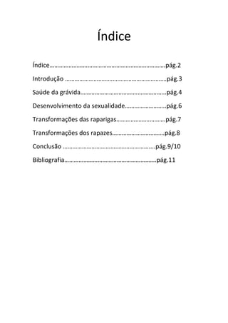 O documento discute a saúde da grávida e o desenvolvimento da sexualidade durante a adolescência. Ele explica os cuidados necessários para uma gravidez saudável, como consultas médicas regulares e uma dieta equilibrada. Também descreve as transformações físicas e psicológicas que ocorrem durante a puberdade tanto em meninas quanto em meninos.