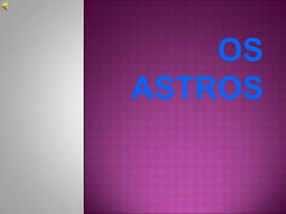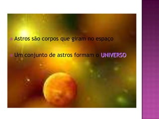 O documento descreve os corpos celestes no universo, incluindo estrelas, planetas, luas, asteróides, cometas e meteoros. Explica que as estrelas emitem sua própria luz, enquanto planetas refletem a luz das estrelas, e destaca o Sistema Solar com o Sol e os planetas que o orbitam, incluindo detalhes sobre a Terra.