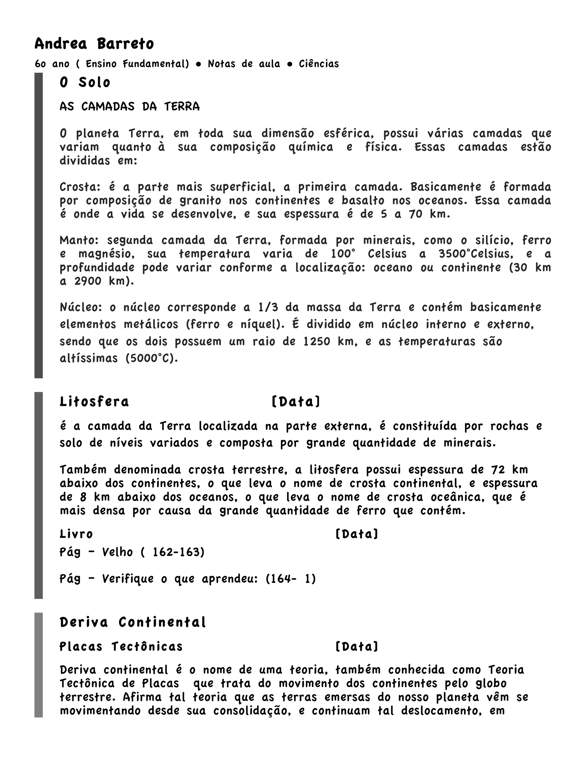 O documento descreve as camadas internas da Terra - a crosta, o manto e o núcleo. Também discute a teoria da deriva continental e das placas tectônicas, explicando como os continentes se movimentam devido às placas se movendo sobre o manto quente. Antigamente havia um supercontinente chamado Pangeia que se fragmentou nos continentes atuais.