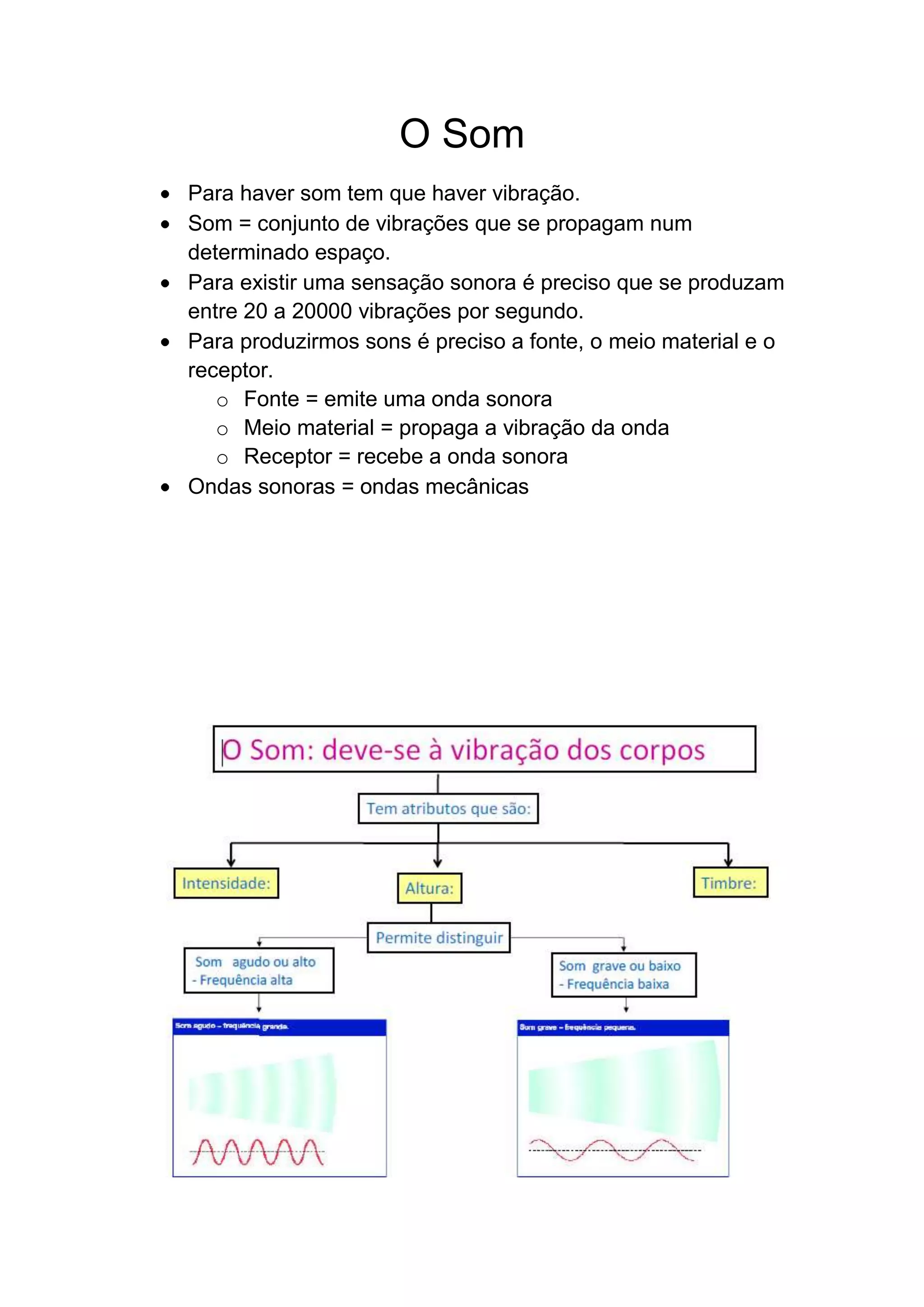 Para que haja som, vibrações entre 20-20.000 vibrações por segundo devem ser produzidas por uma fonte e propagadas através de um meio material até um receptor. Ondas sonoras são ondas mecânicas longitudinais ou transversais que se propagam de uma fonte através de um meio, sendo detectadas por um receptor.