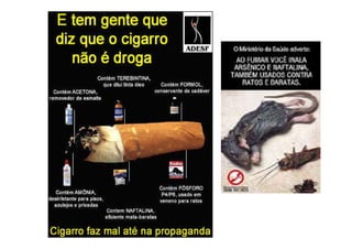 O documento discute os malefícios do tabaco para a saúde. O tabaco contém nicotina e alcatrões, que são altamente aditivos e cancerígenos, respectivamente. O fumo do tabaco causa danos agudos e crônicos aos pulmões e também aumenta o risco de doenças cardíacas através da absorção da nicotina e monóxido de carbono. O tabaco é um dos maiores problemas de saúde pública devido aos seus efeitos tóxicos.