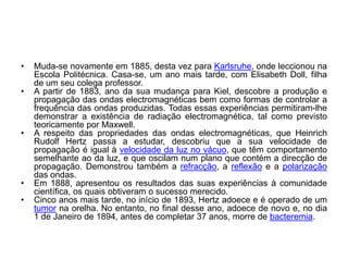 3) Entre 1883 e 1888, Hertz descobriu a existência de ondas eletromagnéticas e estudou suas propriedades, como velocidade e comportamento semelhante à luz.