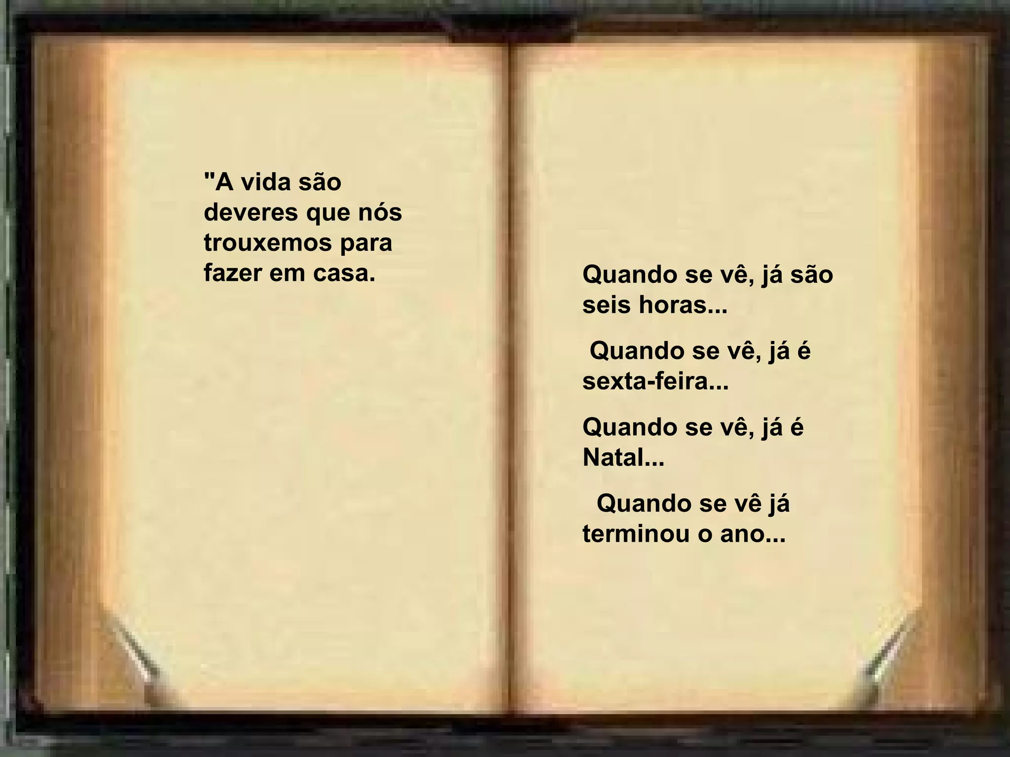 O documento reflete sobre como o tempo passa rapidamente e como é importante aproveitar cada momento da vida, sem deixar de fazer o que gosta ou estar com quem se ama por medo de não ter tempo. A vida é feita de deveres, mas é importante seguir em frente e não olhar o relógio para não perder os amigos nem o amor.