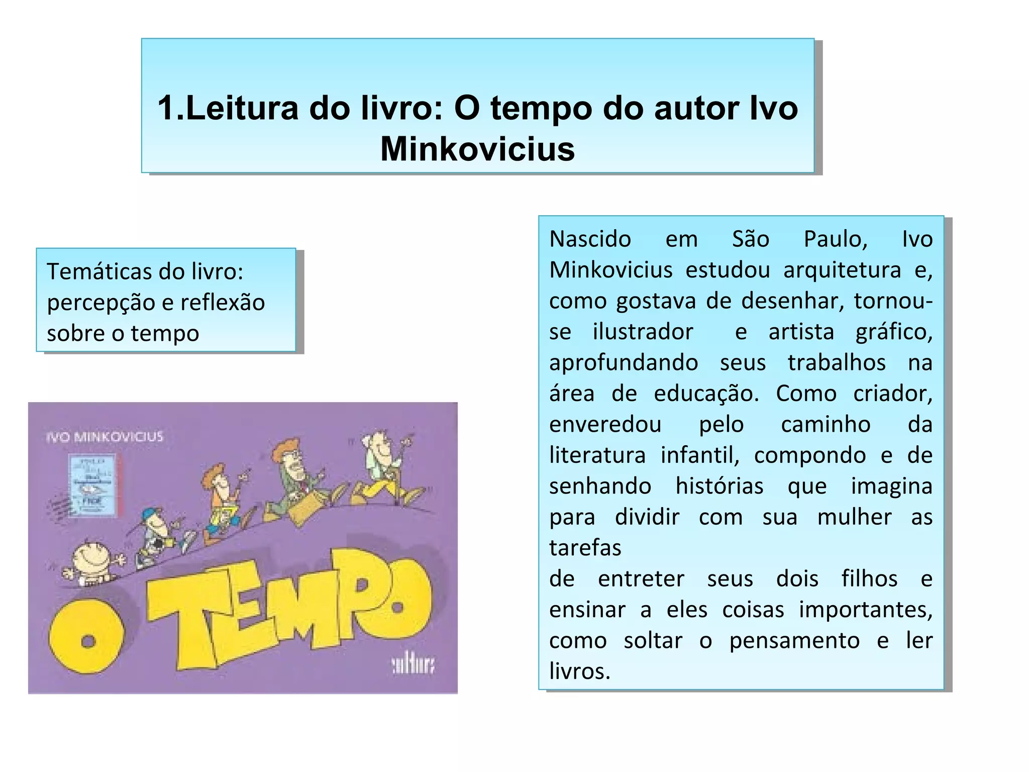 O livro fala sobre o autor Ivo Minkovicius, um ilustrador e artista gráfico brasileiro formado em arquitetura. Ele começou a escrever e ilustrar livros infantis para entreter e ensinar seus dois filhos sobre temas como percepção e reflexão sobre o tempo.