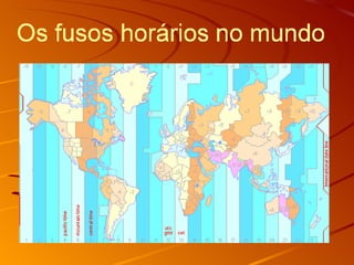 O documento discute os meios naturais e artificiais usados para orientação no tempo e espaço, incluindo a rosa dos ventos, fusos horários e coordenadas geográficas. Explica como calcular a hora em um local sabendo a hora em outro usando a diferença de longitudes e fornece exemplos. Também lista os quatro fusos horários do Brasil.