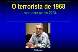 O documento discute um atentado terrorista realizado em 1968 por membros da organização de esquerda Vanguarda Popular Revolucionária (VPR) contra o consulado americano que deixou Orlando Lovecchio mutilado. Quarenta anos depois, o autor critica o fato de que o responsável pelo atentado, Diógenes Carvalho Oliveira, recebe uma aposentadoria maior do que a pensão de Lovecchio. O texto também descreve o passado violento de Diógenes na luta armada e sua posterior filiação ao PT.