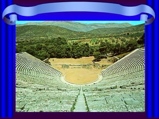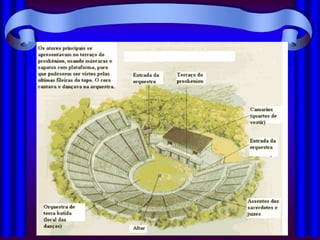 O teatro é uma forma de arte que envolve atores representando uma história para o público. Os principais elementos do teatro são o ator, o texto e o espectador. Outros elementos importantes incluem cenário, figurino, iluminação, som e diferentes tipos de palcos.