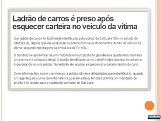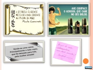 O documento apresenta exemplos de diferentes tipos de texto, incluindo narrativo, descritivo, dissertativo, informativo e conversacional. Também fornece exemplos de cada tipo de texto com trechos curtos retirados de obras literárias e jornais.