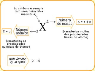O documento descreve o modelo atômico de Rutherford e Bohr. 1) O modelo de Rutherford propôs que os átomos têm um núcleo central com prótons e nêutrons, e elétrons giram em órbitas ao redor do núcleo. 2) Bohr aperfeiçoou este modelo propondo que os elétrons só podem ocupar órbitas discretas. 3) O documento também explica conceitos como número atômico, massa atômica e isótopos.
