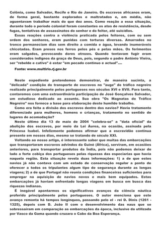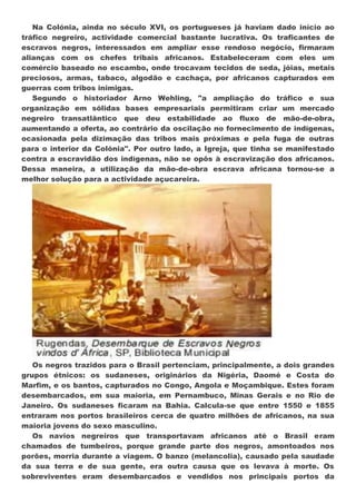 O documento descreve o tráfico de escravos da África para o Brasil durante os séculos XVI e XVII, incluindo: 1) Como os portugueses estabeleceram alianças com chefes tribais africanos para trocar bens por escravos; 2) Os dois principais grupos étnicos de escravos trazidos - sudaneses e bantos; 3) As péssimas condições a bordo dos navios "tumbeiros" que levavam os escravos.