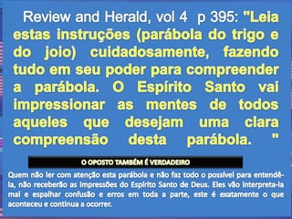 1) A parábola representa a Igreja Adventista do Sétimo Dia, onde Cristo plantou boas doutrinas, mas líderes adormeceram e permitiram que Satanás plantasse falsas doutrinas.