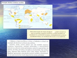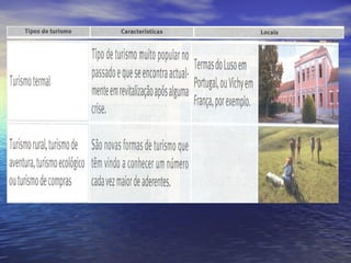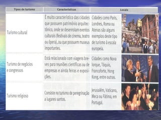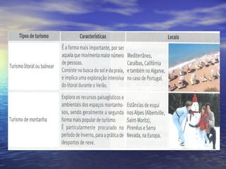 O documento discute o turismo como uma indústria importante para a economia. Define turismo como deslocamento voluntário de pessoas por mais de 24 horas para fora de sua residência ou trabalho. Explora os tipos de turismo internacional e nacional e discute os principais destinos turísticos globais como Europa, Ásia Oriental e América do Norte. Também discute os impactos sociais, econômicos e ambientais do turismo em Portugal.
