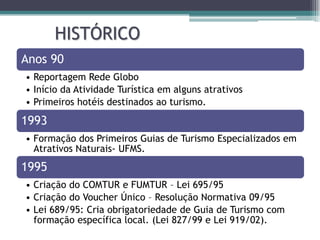 O documento descreve o desenvolvimento do turismo na cidade de Bonito, MS, Brasil desde os anos 1990, quando os primeiros hotéis e guias de turismo foram estabelecidos. Desde então, vários órgãos e leis foram criados para regular a indústria do turismo, e Bonito tem sido reconhecido repetidamente como o melhor destino de ecoturismo do Brasil.