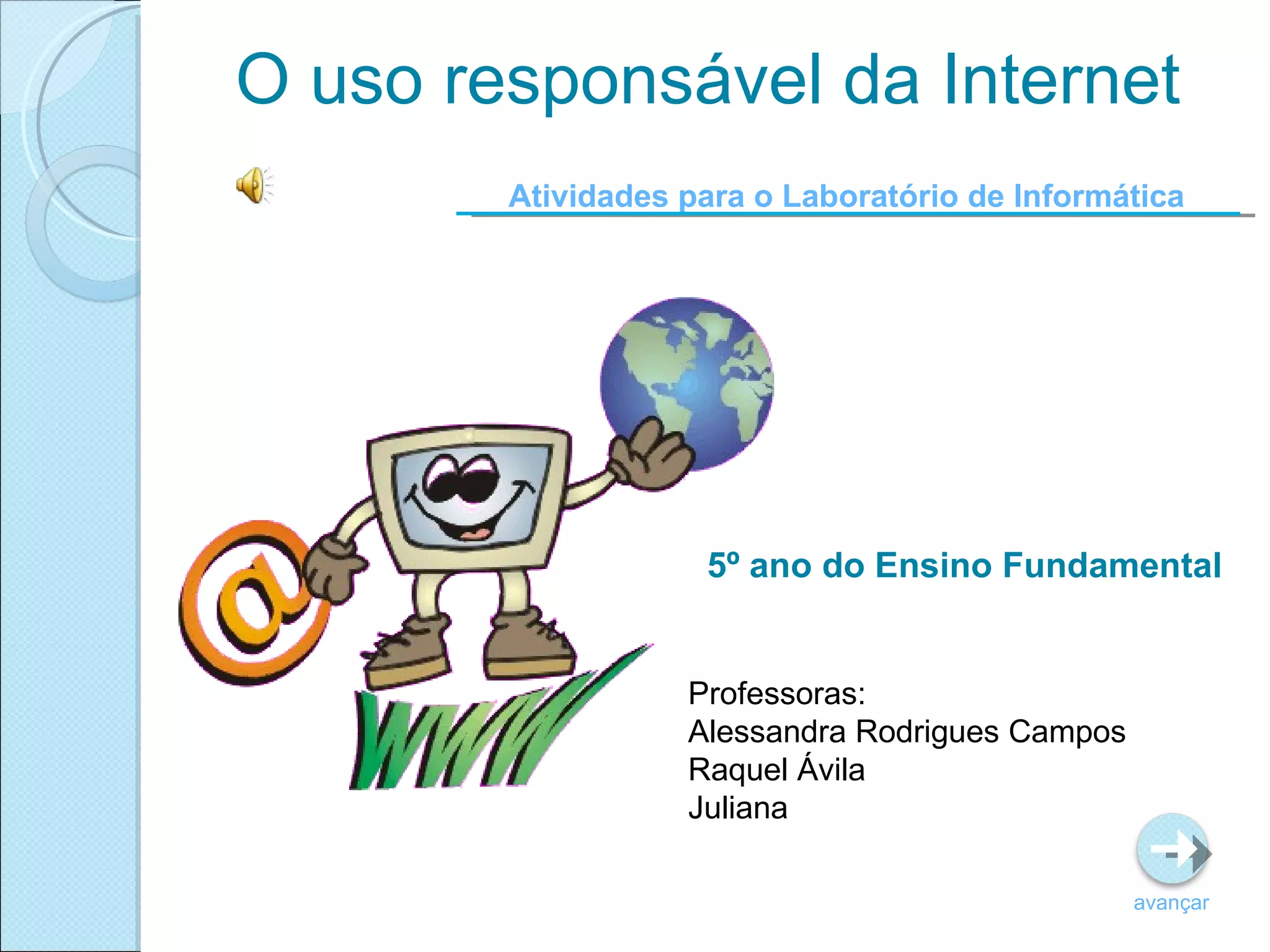 O documento descreve um projeto de 10 encontros para ensinar alunos do 5o ano sobre o uso responsável da internet. Cada encontro inclui etapas como assistir vídeos, ler textos, participar de debates e criar histórias em quadrinhos sobre o tema. O objetivo é conscientizar as crianças sobre os benefícios e riscos da internet e como usá-la de forma segura e produtiva.