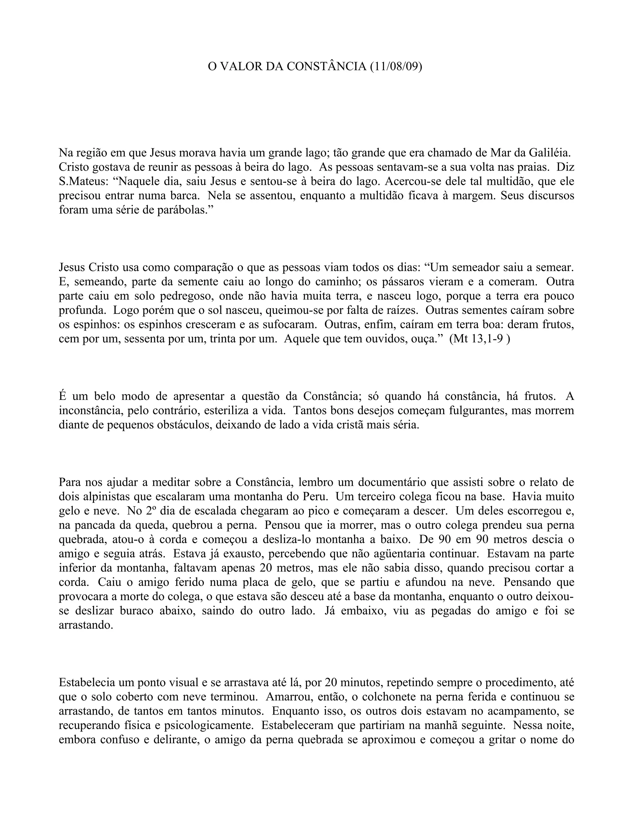 O documento discute a importância da constância para alcançar objetivos na vida. Ele apresenta a parábola do semeador de Jesus e fala sobre a história de um alpinista que quebrou a perna durante uma escalada, mas perseverou para sobreviver. Também lista cinco obstáculos à constância - entusiasmo superficial, cansaço, preguiça, desânimo e impaciência - e enfatiza a necessidade de perseverança para vencê-los.