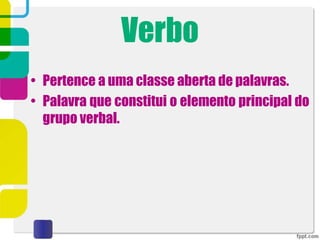 O documento descreve as principais características dos verbos na língua portuguesa, incluindo suas subclasses, como verbos principais, copulativos e auxiliares. Também explica os diferentes tipos de conjugação, tempos, modos e pessoas verbais.