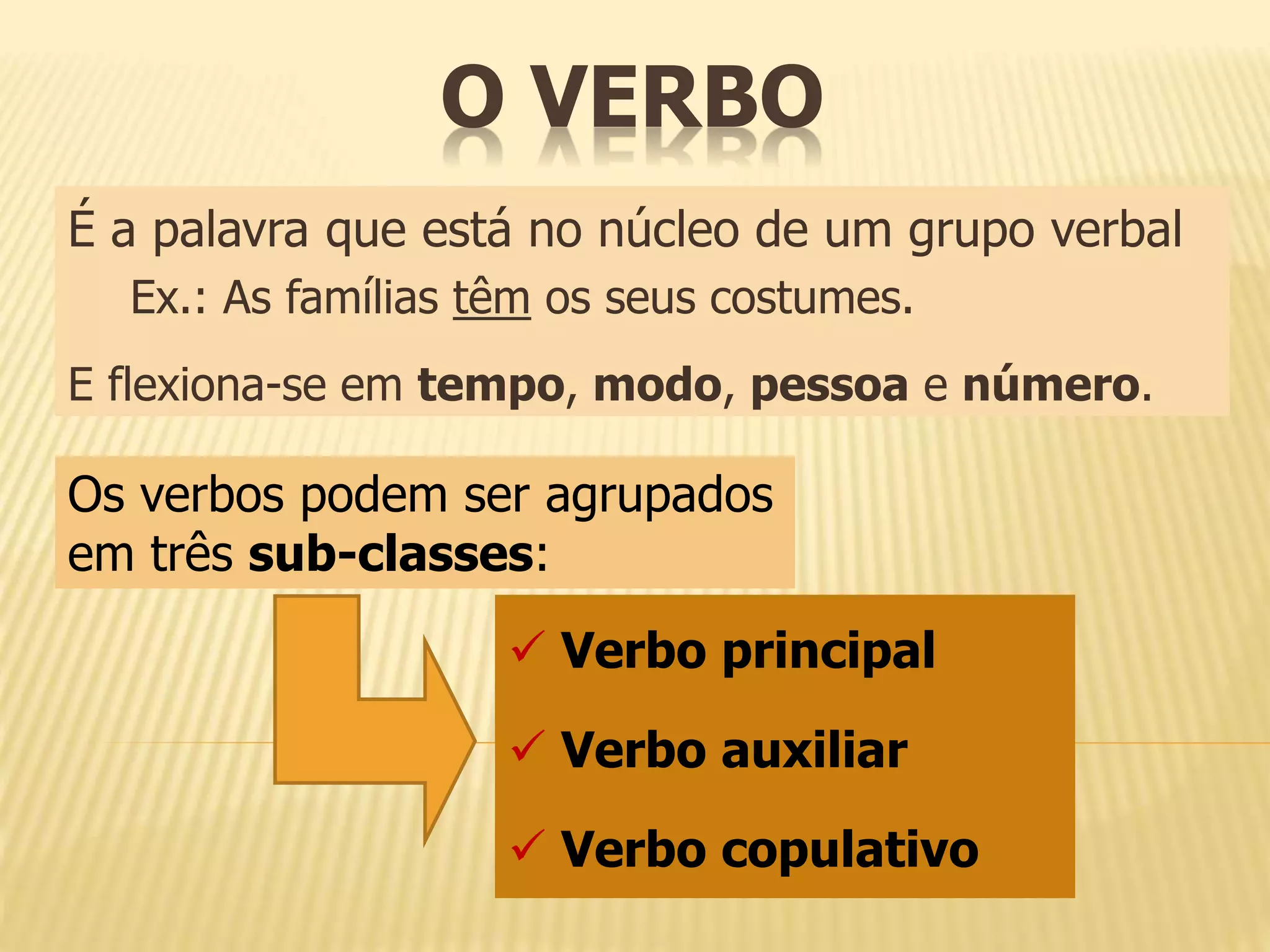 O documento discute os diferentes tipos de verbos em português: verbos principais (intransitivos, transitivos diretos, indiretos e diretos e indiretos), verbos copulativos e verbos auxiliares. Verbos principais podem requerer apenas um sujeito ou um sujeito e um ou mais complementos, enquanto verbos copulativos requerem um sujeito e um predicativo do sujeito e verbos auxiliares formam complexos verbais com outros verbos.