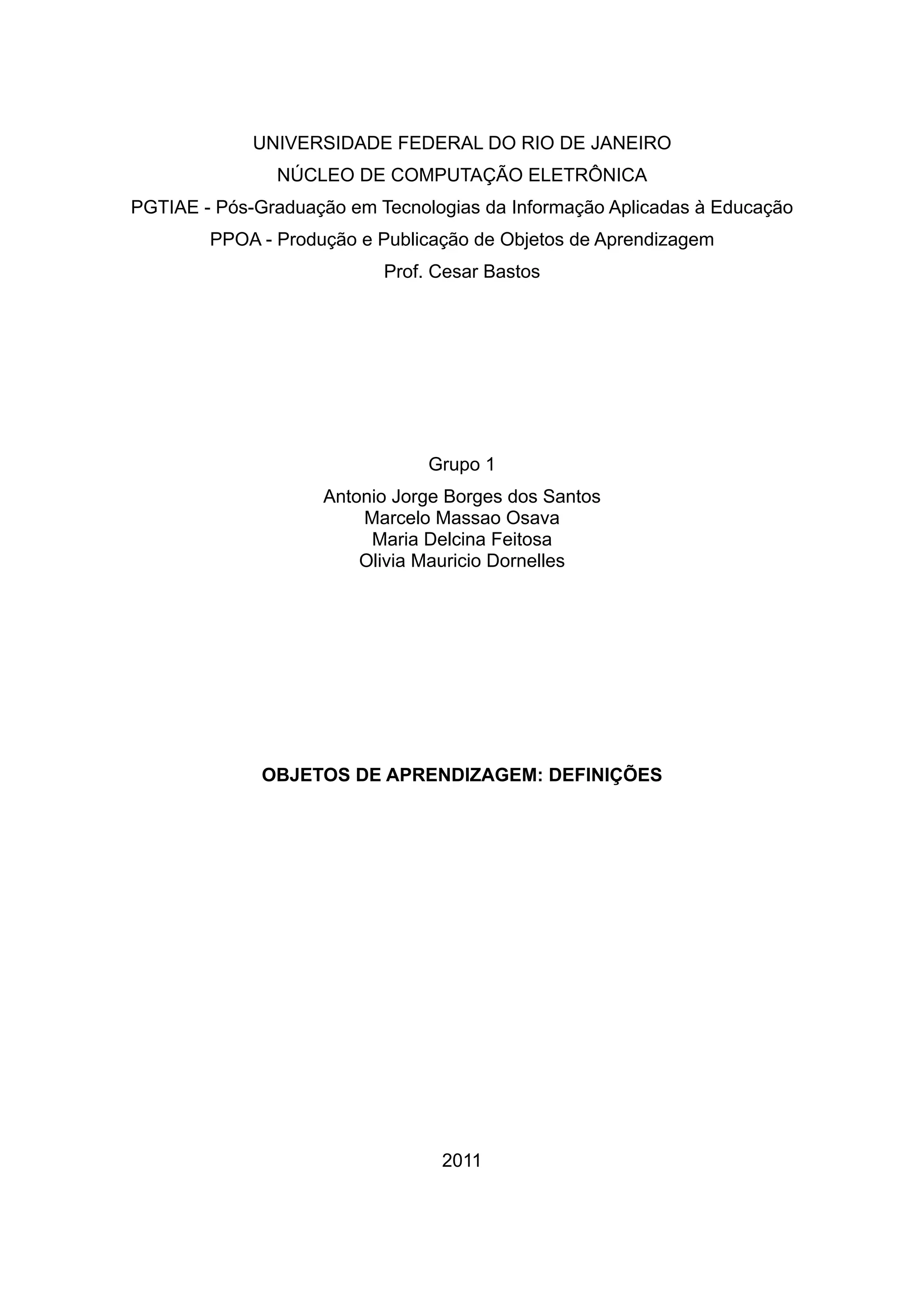 1. O documento apresenta definições de objetos de aprendizagem coletadas da internet, agrupadas cronologicamente para mostrar a evolução do conceito.