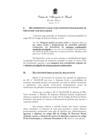 1. O documento descreve uma ação declaratória de constitucionalidade proposta pelo Conselho Federal da Ordem dos Advogados do Brasil questionando o alcance do artigo 283 do Código de Processo Penal à luz do princípio da presunção de inocência.