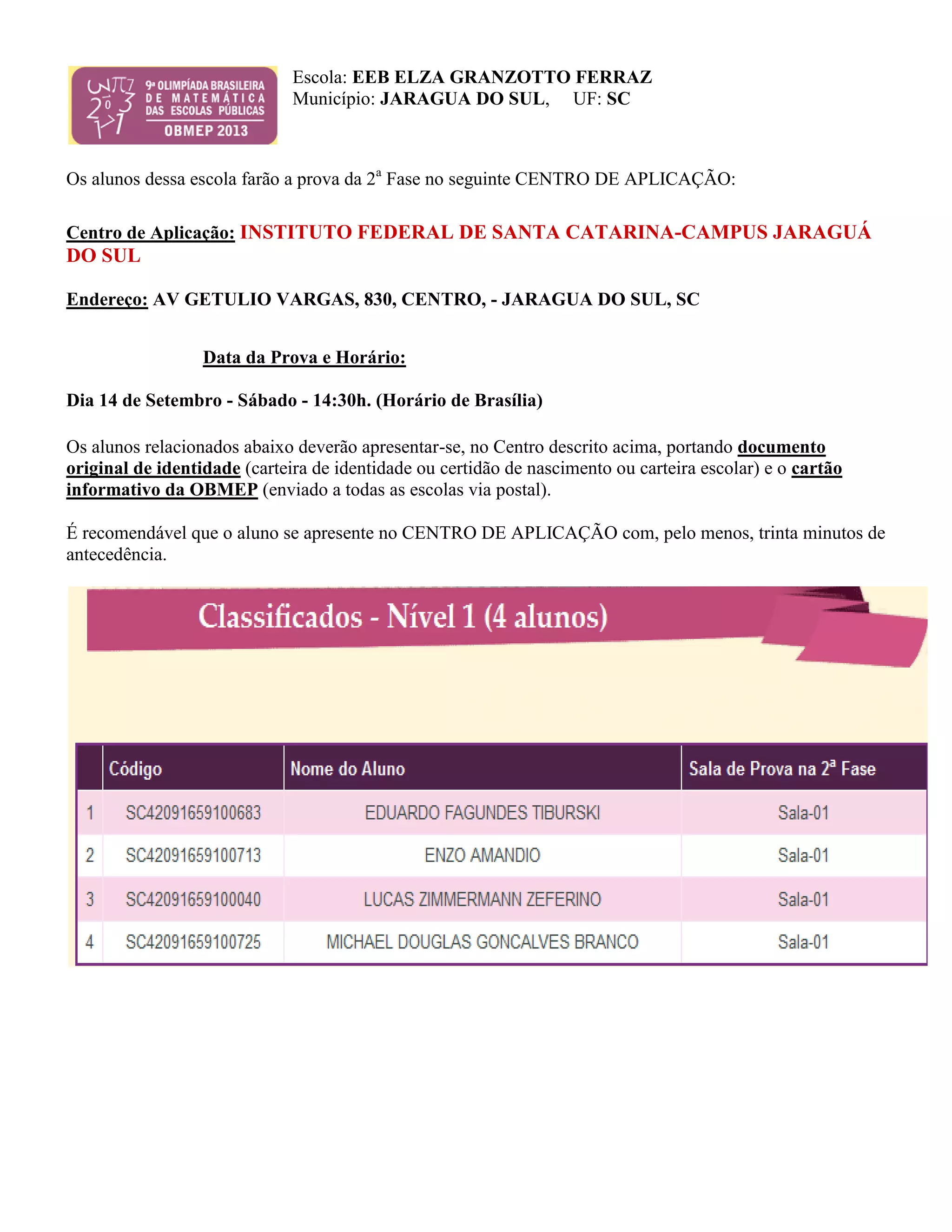 Este documento fornece informações sobre a segunda fase da OBMEP para alunos da EEB ELZA GRANZOTTO FERRAZ em Jaraguá do Sul, SC. A prova será realizada no dia 14 de setembro às 14h30 no Instituto Federal de Santa Catarina campus Jaraguá do Sul na Avenida Getúlio Vargas, 830. Os alunos devem levar documento de identidade e cartão da OBMEP e chegar com 30 minutos de antecedência.