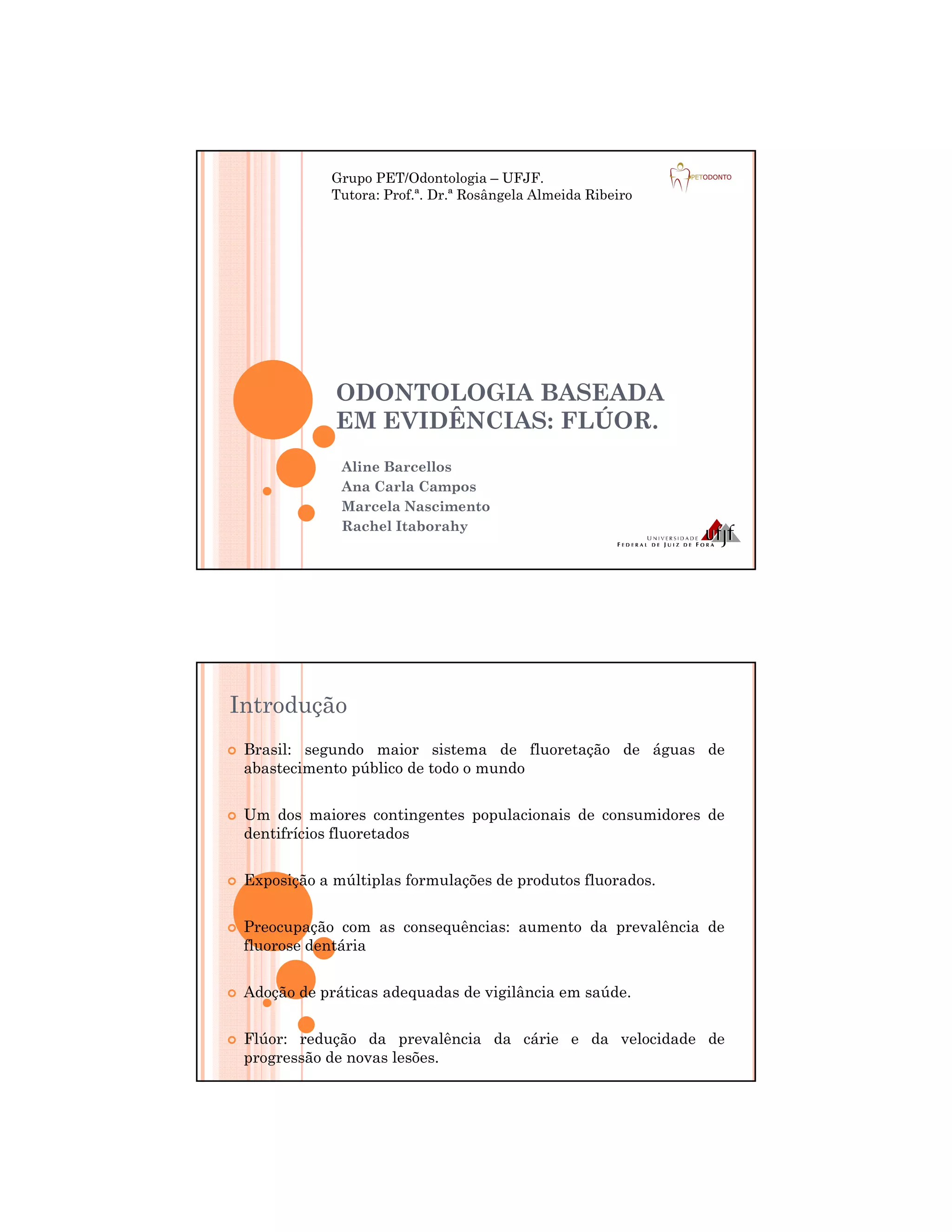 1. O documento discute as tendências e controvérsias sobre o uso do flúor em diferentes formas de administração para prevenção e promoção da saúde bucal.