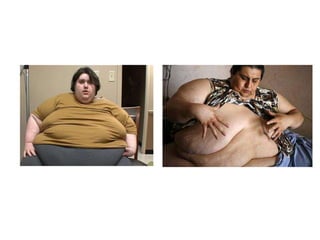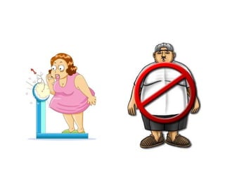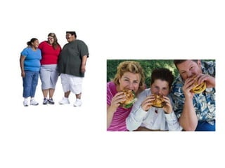O documento discute obesidade, definindo-a como um acúmulo excessivo de gordura corporal que traz riscos à saúde. Ele explica os principais tipos de obesidade (nutricional, comportamental, psicológica, genética, duradoura e mórbida), causas, diagnóstico, tratamento através de reeducação alimentar, exercício e cirurgia, e prevenção por meio de estilo de vida saudável desde a infância.