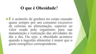 O documento aborda a obesidade, destacando suas causas, classificações e os métodos de diagnóstico, como o cálculo do Índice de Massa Corporal (IMC). Discute diferentes tipos de obesidade, como nutricional, comportamental, genética e psicológica, e aborda tratamentos com foco em mudanças de estilo de vida e opções cirúrgicas. Também alerta para os riscos associados a medicamentos e a importância de cuidados na escolha de tratamentos para a obesidade.