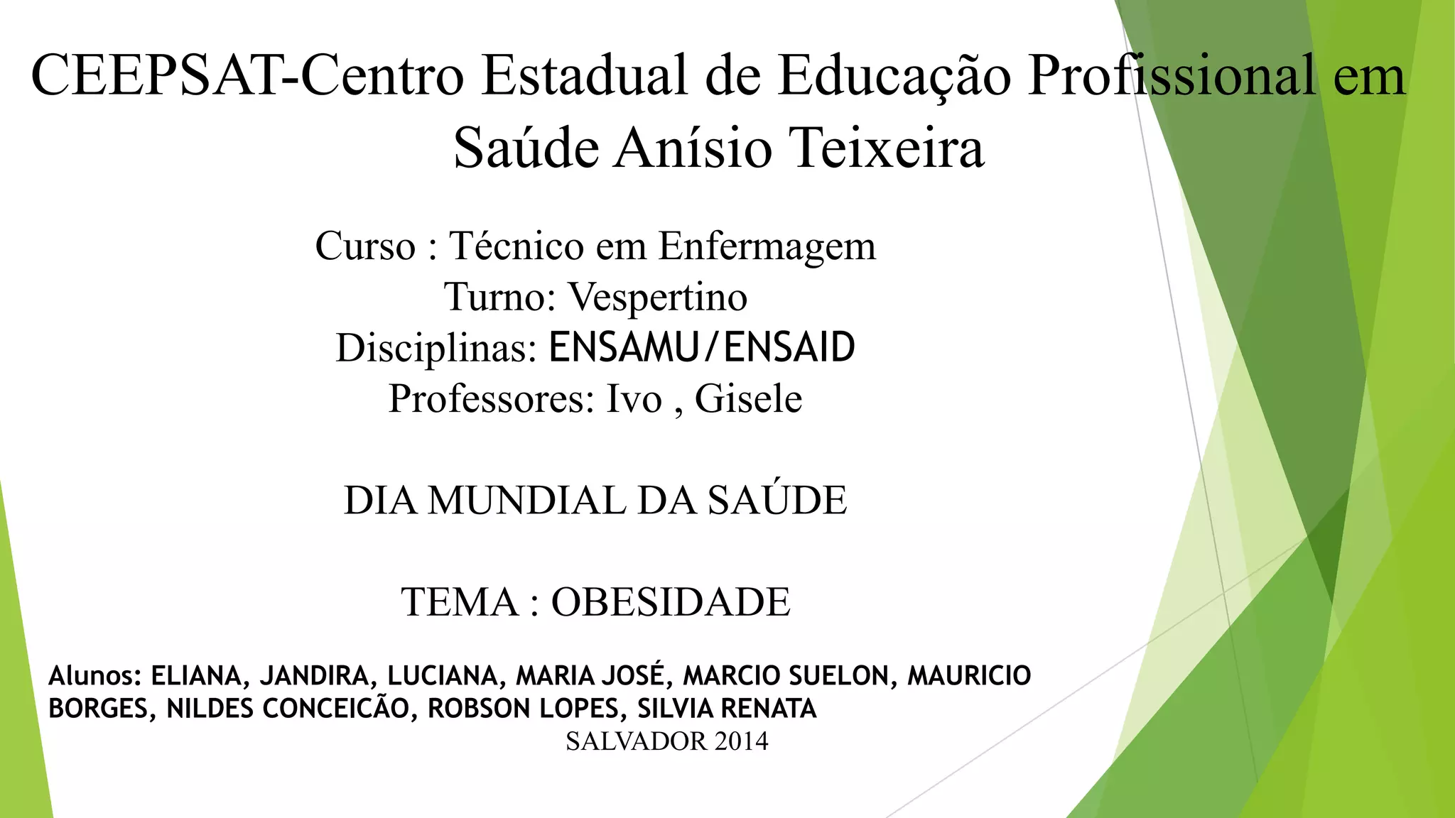 O documento discute o tema da obesidade, definindo-a como o acúmulo excessivo de gordura no corpo causado por um consumo calórico maior do que o gasto energético. Apresenta os tipos de obesidade, formas de diagnóstico, tratamentos como mudança nos hábitos alimentares e de exercícios, medicamentos e cirurgia bariátrica, além de possíveis complicações e cuidados necessários.