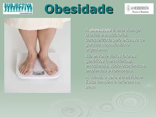 A obesidade é uma doença crônica multifatorial caracterizada pelo excesso de gordura no corpo. Fatores genéticos, emocionais, socioeconômicos e ambientais contribuem para a obesidade, que aumenta o risco de problemas de saúde como doenças cardíacas e diabetes. Mudanças no estilo de vida incluindo dieta balanceada e exercícios regulares são necessárias para prevenir e controlar a obesidade.