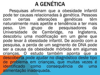 A obesidade infantil pode ser influenciada por fatores genéticos e hábitos alimentares inadequados, levando a problemas de saúde como hipertensão e diabetes. A atuação de pais e escolas é crucial para orientar crianças sobre alimentação saudável e combater o bullying relacionado ao peso. A promoção de uma reeducação alimentar é necessária para enfrentar o crescente problema da obesidade entre jovens.