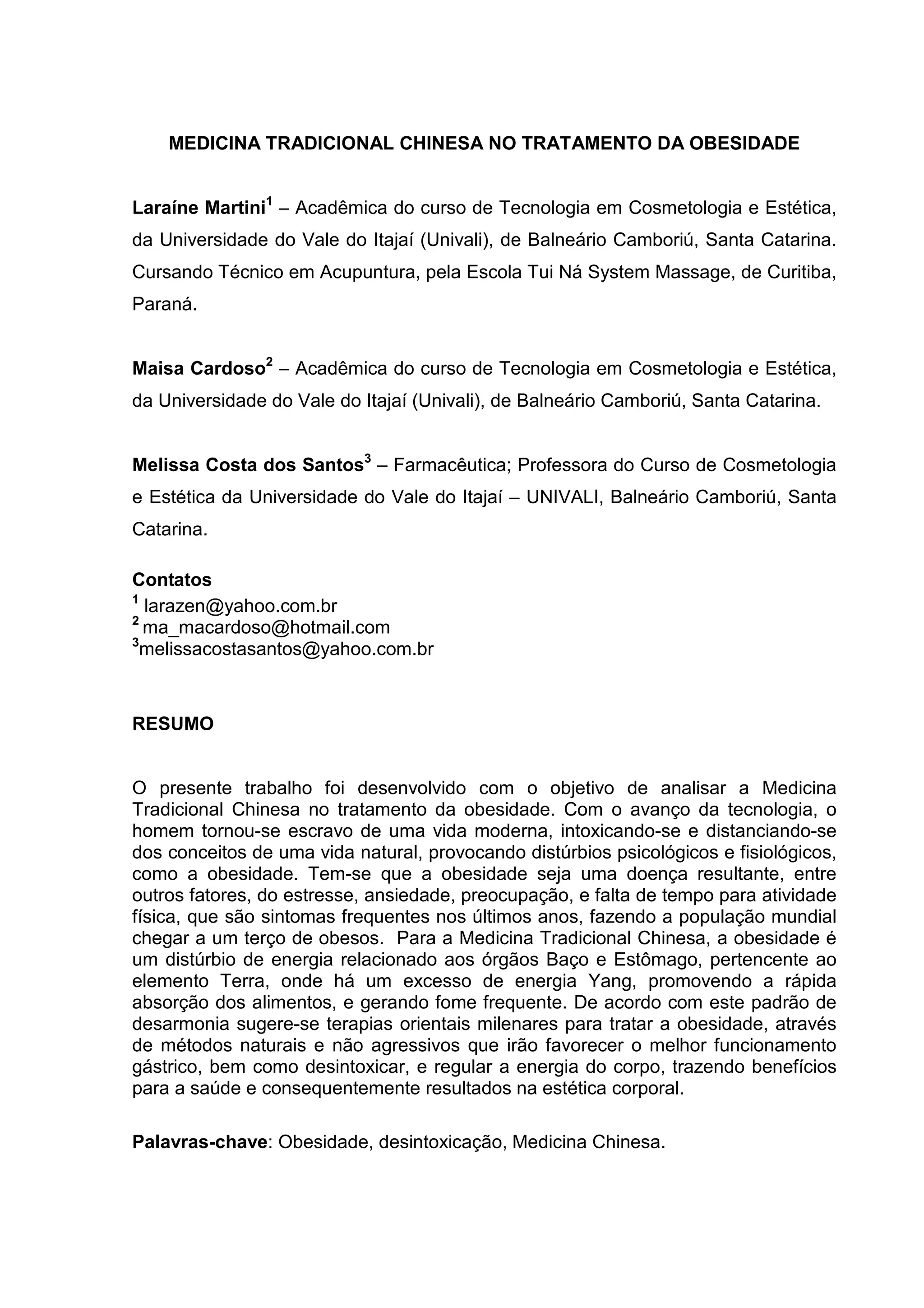 O documento discute a Medicina Tradicional Chinesa no tratamento da obesidade. A obesidade é vista como um desequilíbrio energético entre yin e yang, relacionado aos órgãos Baço e Estômago. A Medicina Tradicional Chinesa utiliza terapias como dietoterapia chinesa, fitoterapia, acupuntura e auriculoterapia para restaurar o equilíbrio energético e emocional, promovendo a perda de peso de forma natural.