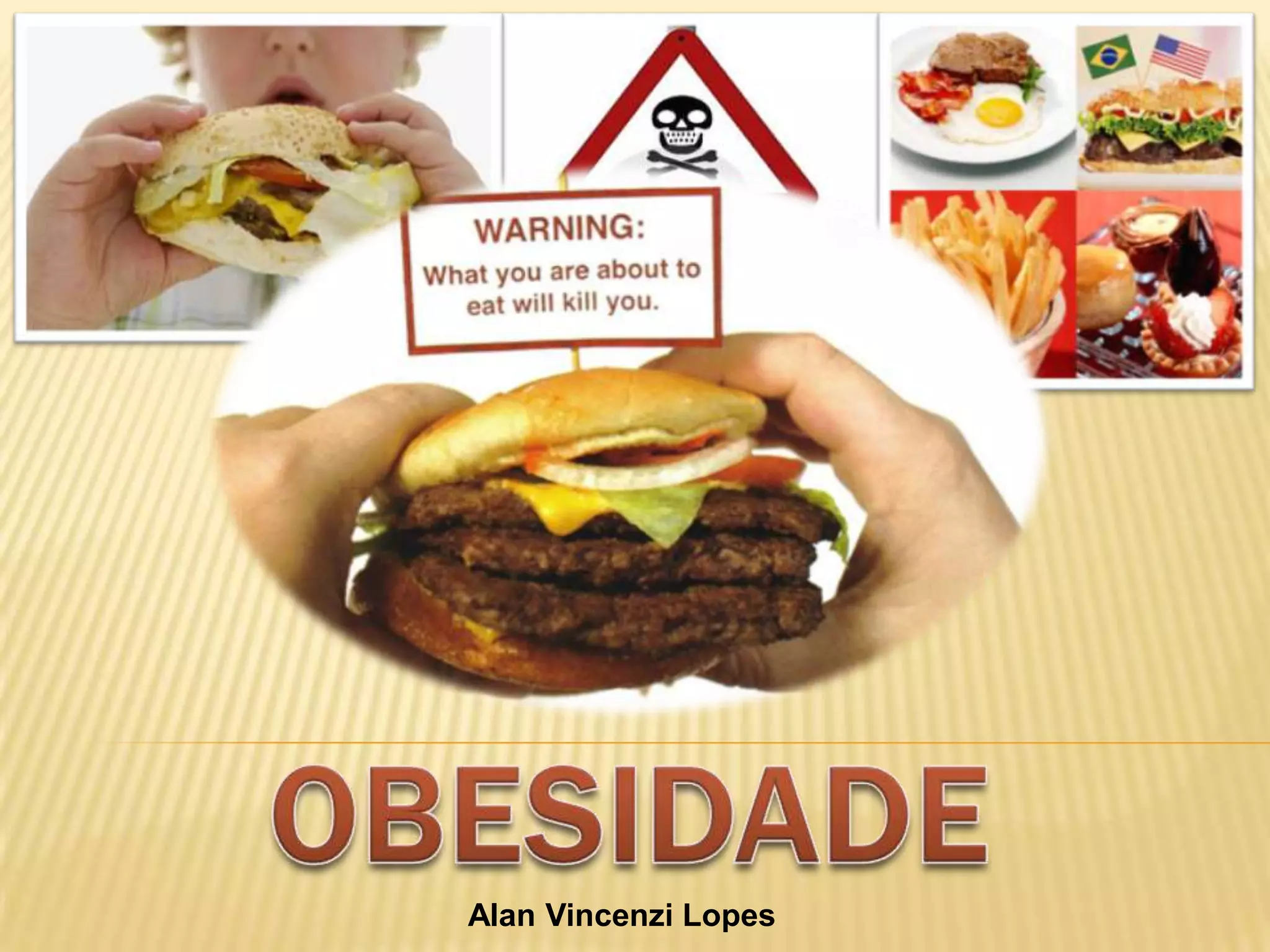 O documento discute obesidade, definindo-a como um acúmulo excessivo de gordura corporal que traz riscos à saúde. Explora causas como fatores genéticos, estilo de vida e distúrbios psiquiátricos, além de classificar tipos de obesidade. Também aborda complicações de saúde relacionadas à obesidade e formas de tratamento, incluindo balão gástrico e banda gástrica ajustável.