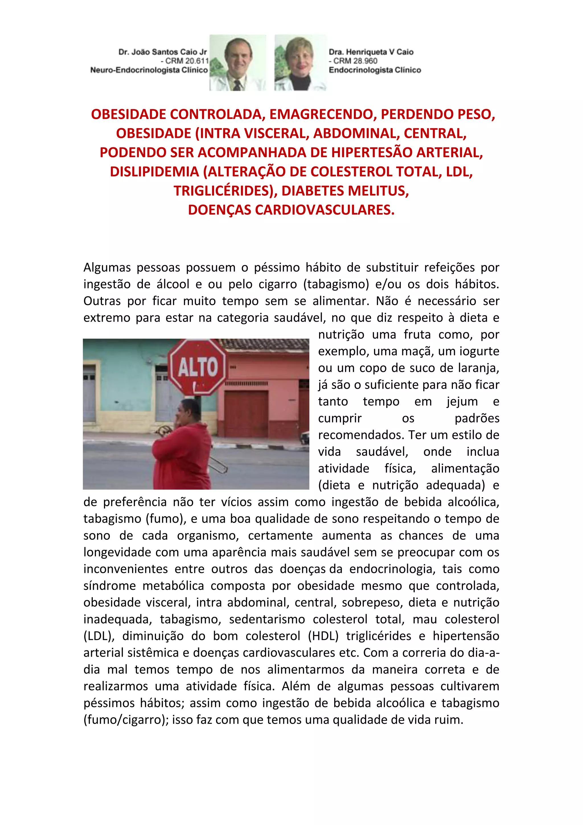 O documento discute os riscos à saúde associados à obesidade, incluindo hipertensão, doenças cardiovasculares e diabetes. Também menciona hábitos pouco saudáveis como fumar, beber álcool e dieta inadequada, e como esses fatores podem contribuir para doenças endócrinas e reduzir a longevidade.
