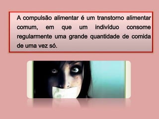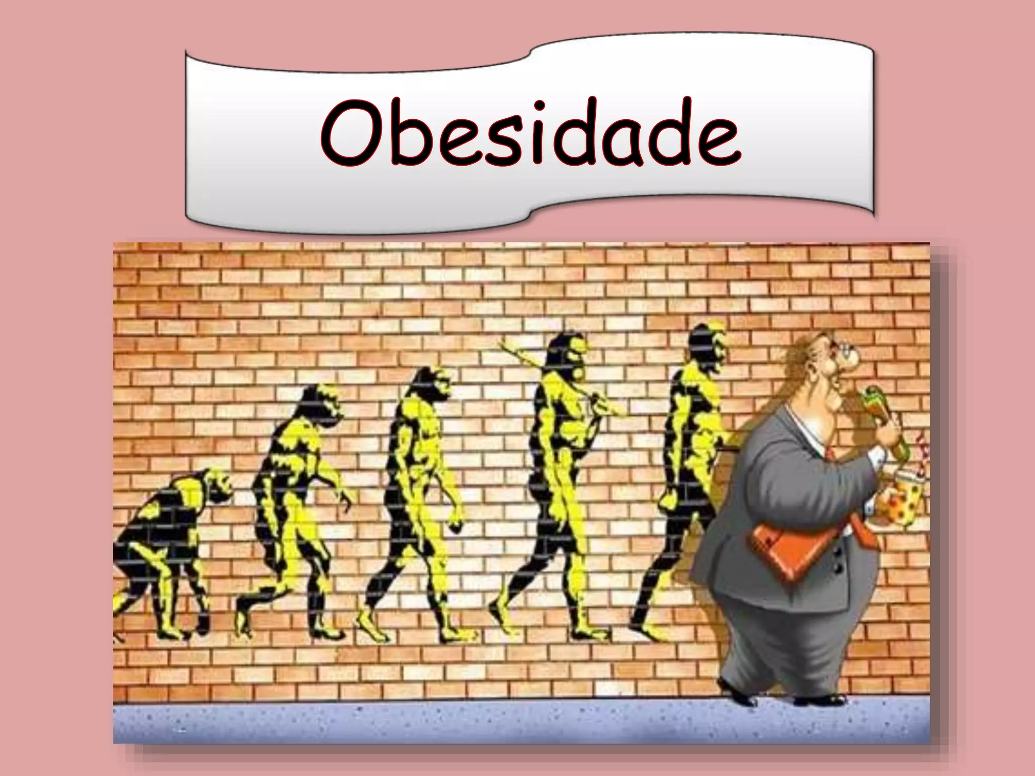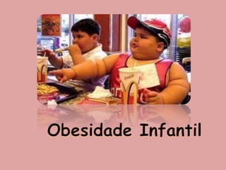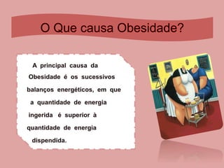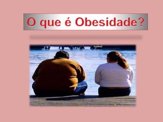 O documento discute obesidade, definindo-a como uma doença crônica caracterizada pelo acúmulo excessivo de gordura corporal que pode afetar gravemente a saúde e levar à morte. A obesidade é diagnosticada pelo Índice de Massa Corporal (IMC), que mede a corpulência de acordo com peso e altura. Vários fatores como genética, estilo de vida sedentário e alimentação inadequada podem levar à obesidade.