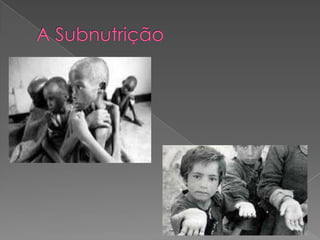 O documento discute os problemas globais da subnutrição e fome. Milhões de crianças na Índia e em outros países sofrem de subnutrição e morrem anualmente, principalmente devido à pobreza extrema. A subnutrição causa doenças graves e morte em crianças e adultos em todo o mundo.