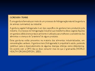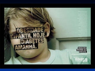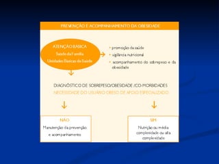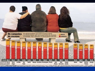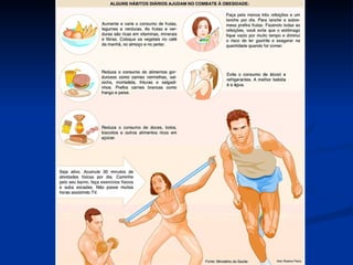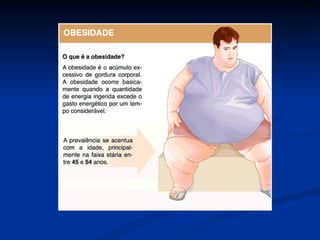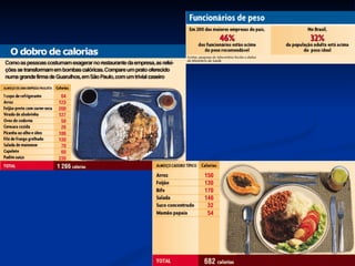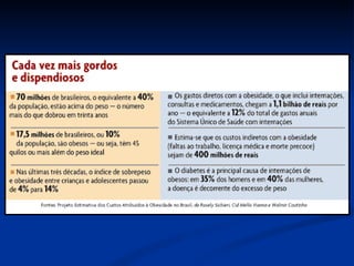 O documento discute vários aspectos relacionados à obesidade e seus impactos na saúde e no trabalho. Apresenta estatísticas sobre a tendência crescente da obesidade no Brasil e seus custos econômicos. Também aborda como a alimentação no ambiente de trabalho e o consumo em fast foods podem contribuir para o ganho de peso. Explora ainda os diferentes tipos de obesidade e suas implicações metabólicas.
