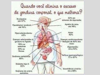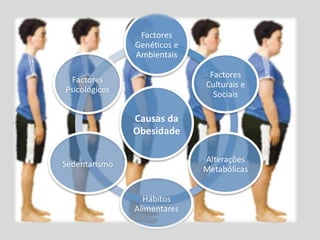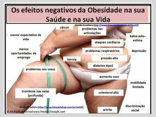 O documento discute obesidade, definindo-a como excesso de gordura corporal que resulta em peso acima do ideal. A obesidade ocorre quando se consome mais calorias do que se gasta. Fatores como hábitos alimentares ruins, falta de exercício e tempo excessivo em frente à TV podem contribuir. Dados mostram que cerca de 30% das crianças brasileiras têm sobrepeso ou são obesas. Tratamentos incluem dietas, exercícios, drogas e cirurgias.