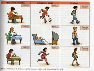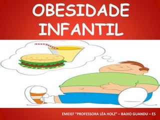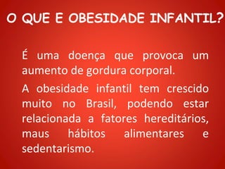 O documento discute obesidade infantil, definindo-a como um aumento de gordura corporal que tem crescido no Brasil devido a fatores como alimentação inadequada e sedentarismo. Ele lista causas como amamentação curta, ingestão precoce de alimentos inadequados e problemas genéticos, e consequências como problemas de saúde e baixa autoestima. A prevenção inclui refeições corretas, horários de alimentação, atividade física regular e uma dieta saudável.