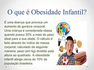 O documento discute obesidade infantil, definindo-a como um excesso de 20% do peso ideal para a idade de uma criança. Apresenta as principais causas como período curto de amamentação, alimentação inadequada e problemas genéticos. Também lista consequências como problemas psicológicos, diabetes, hipertensão e distúrbios ortopédicos. Finalmente, dá dicas de prevenção como refeições regulares, atividade física e evitar alimentos industrializados.