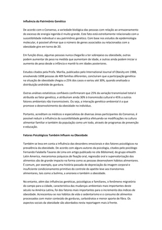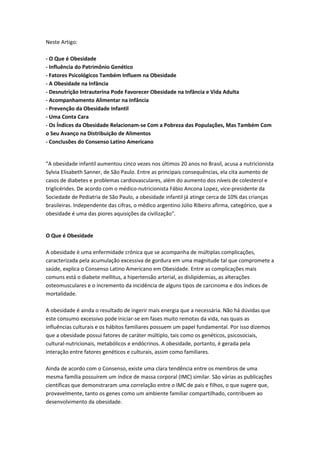 O documento discute a obesidade infantil no Brasil, seus fatores de risco e recomendações para prevenção. Fatores como genética, desnutrição intrauterina, hábitos alimentares e sedentarismo influenciam na obesidade. Uma alimentação balanceada rica em frutas, verduras e proteínas é recomendada para crianças, porém inacessível financeiramente para muitas famílias.