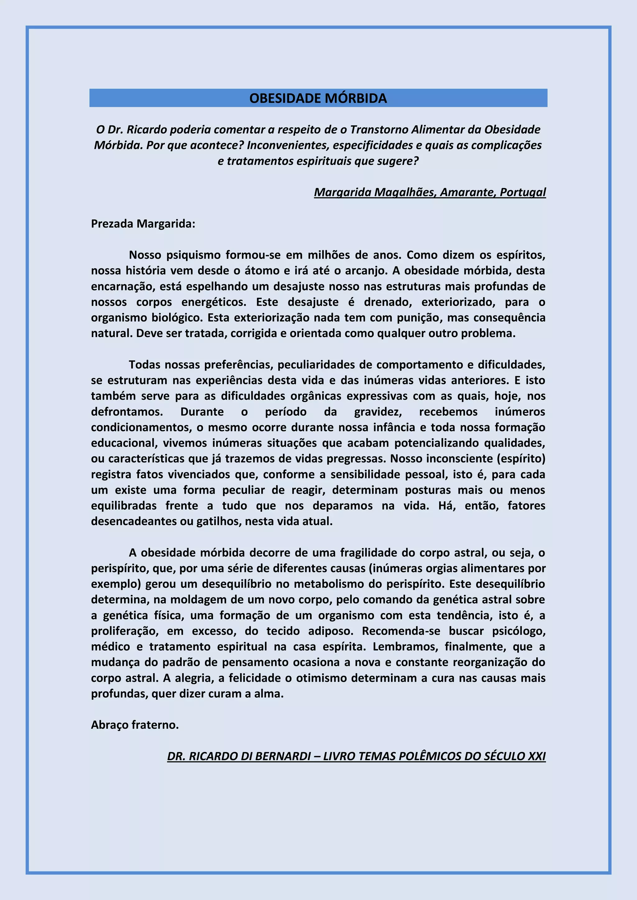 A obesidade mórbida ocorre devido a um desequilíbrio no corpo astral que afeta o metabolismo, levando à formação de um corpo com tendência ao excesso de gordura. Ela reflete um desajuste nas estruturas mais profundas dos corpos energéticos, influenciado por experiências de vidas passadas. O tratamento envolve buscar apoio médico, psicológico e espiritual, além de mudanças no pensamento que promovam alegria e cura na alma.